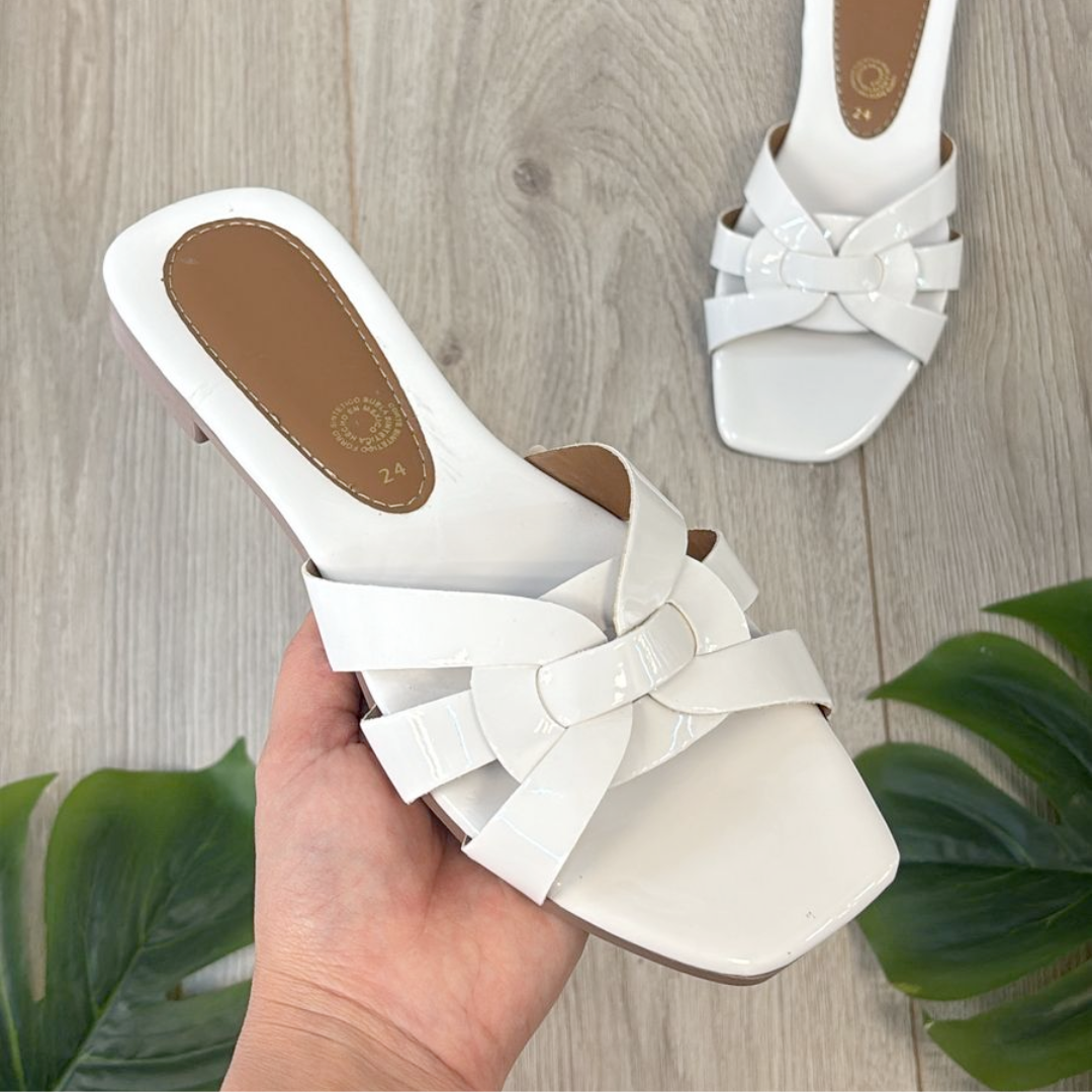 Sandalia de tacón bajo con diseño entrelazado en charol blanco late. Ideal para un look pulido, femenino y fresco, sin renunciar a la comodidad.