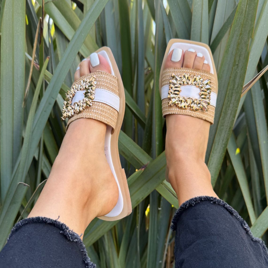 Las sandalias Brisa Blanca son el balance perfecto entre lo artesanal y lo chic. Su diseño con rafia tejida, tira blanca y broche con pedrería aporta frescura, ligereza y un toque sofisticado a cualquier outfit veraniego.