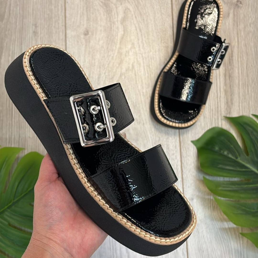 Un clásico renovado. Estas sandalias en charol negro con hebilla metálica plateada ofrecen un look atrevido y sofisticado. El contraste con su plataforma negra realza su presencia y las convierte en un statement total para salidas de noche o combinaciones urbanas con actitud. 🔲