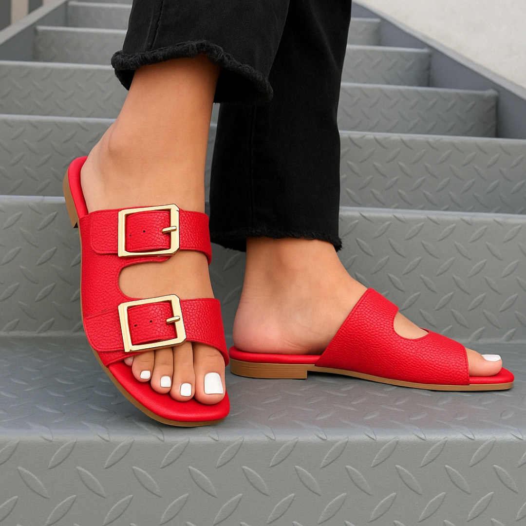 Estas sandalias de doble hebilla dorada fusionan comodidad y estilo con un diseño moderno de punta cuadrada y acabado en piel texturizada. El tono Rojo Encendido aporta un toque vibrante y audaz que complementa cualquier outfit, desde el más relajado hasta el más trendy. 💃