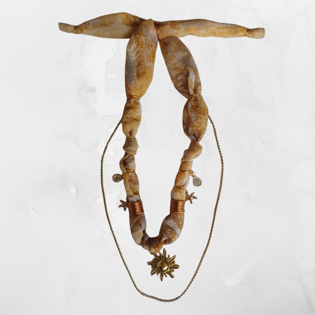 El Collar Niza es una pieza artesanal que combina elegancia y energía positiva. Confeccionado en tela satinada en tonos dorados y detalles metálicos, incorpora un dije central en forma de sol que irradia vitalidad y estilo. Sus aros y adornos en dorado aportan un aire sofisticado y versátil, ideal para quienes buscan un accesorio único que realce su look.