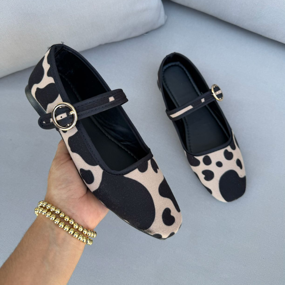 Dale un toque único a tu estilo con nuestros flats Cow Brown, diseñados con estampado cow print en tonos café que combinan con todo. Son ligeros, cómodos y perfectos para usar todo el día.