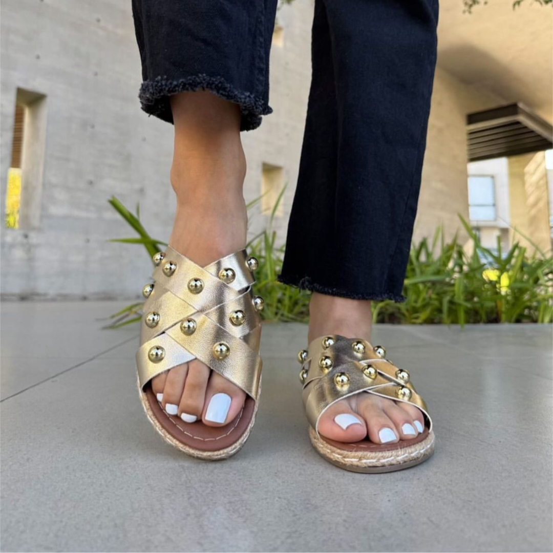 Estas sandalias cruzadas en tono Dorada Imperial elevan tu estilo con un toque glam. El diseño trenzado con aplicación de tachuelas doradas le da un aire audaz y femenino, perfecto para looks casuales con mucho carácter.