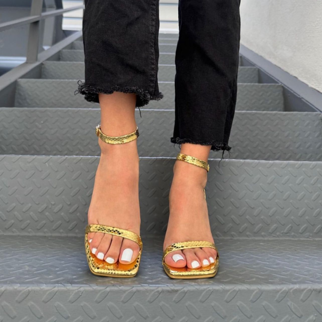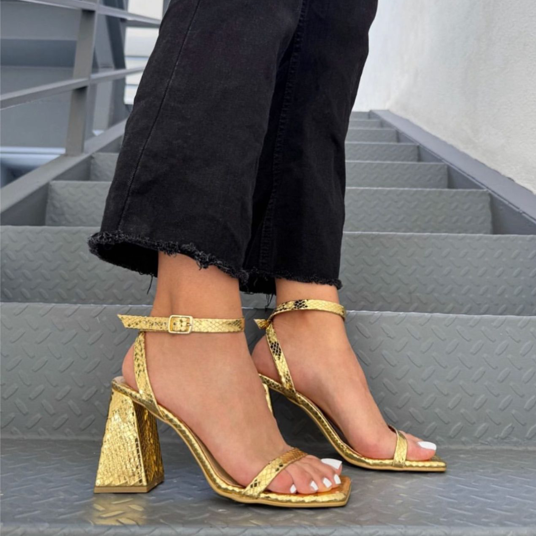 Las sandalias Golden Hour están hechas para robar miradas. Su acabado dorado efecto piel de serpiente, tacón bloque geométrico y diseño minimalista de tiras finas, elevan cualquier outfit de noche o de evento especial.