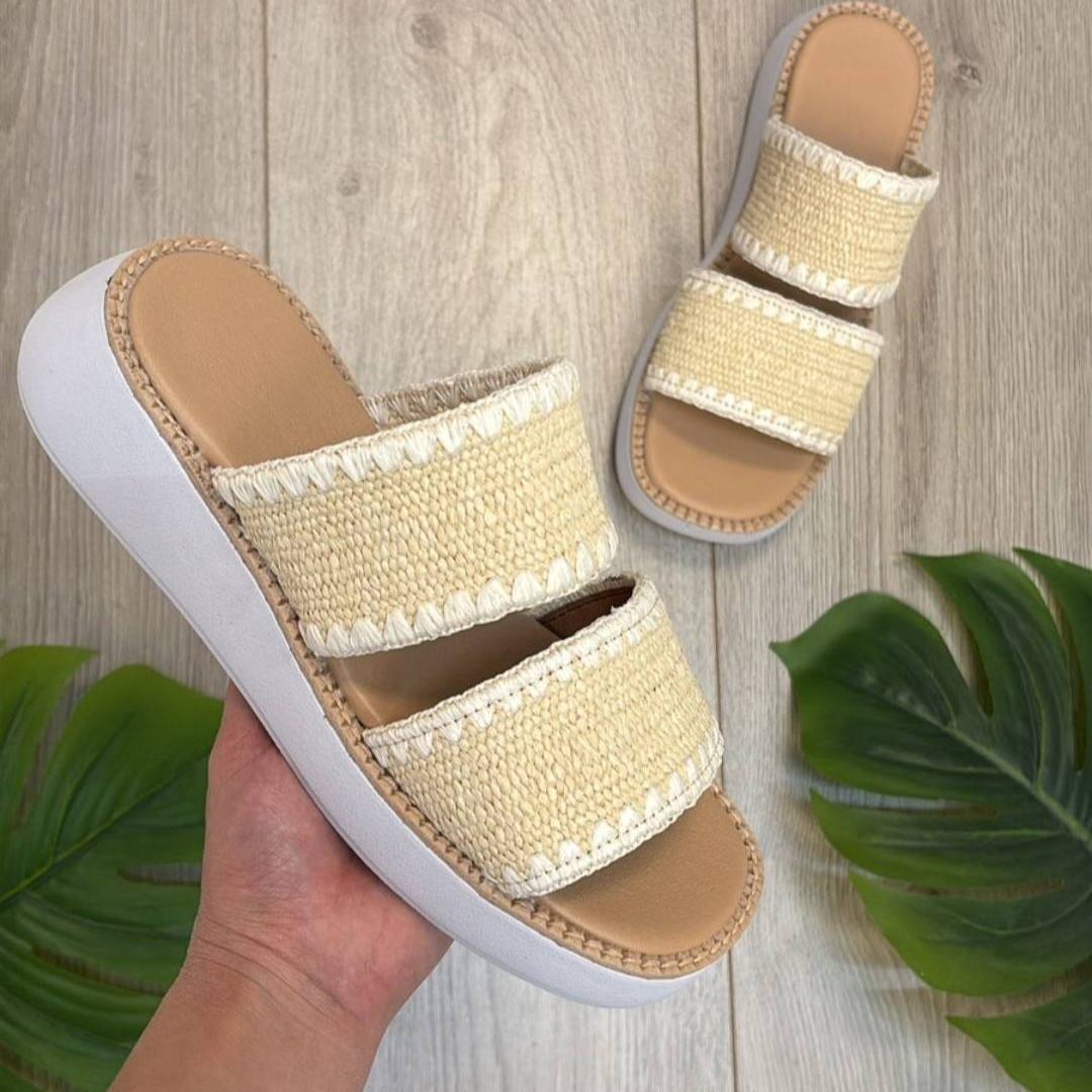 Perfectas para paseos largos, días soleados o para darle un twist bohemio a cualquier outfit. Su plantilla acolchada y su suela elevada aseguran confort durante todo el día. 🌿🩴