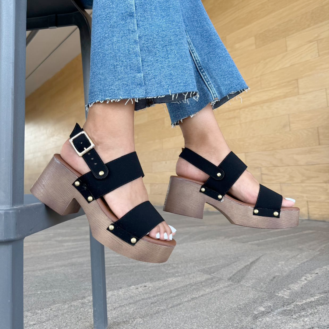 Estas sandalias negras de plataforma son el equilibrio perfecto entre comodidad y actitud. Con tiras anchas, hebilla ajustable y estoperoles dorados, son ideales para caminar con seguridad y estilo 👡