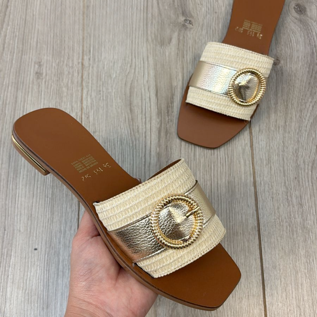 Dale un giro fresco y elegante a tus looks con los Olivetta. Su diseño combina texturas naturales con un acabado metálico en dorado que resalta gracias a la hebilla decorativa. Son el equilibrio perfecto entre lo artesanal y lo moderno.