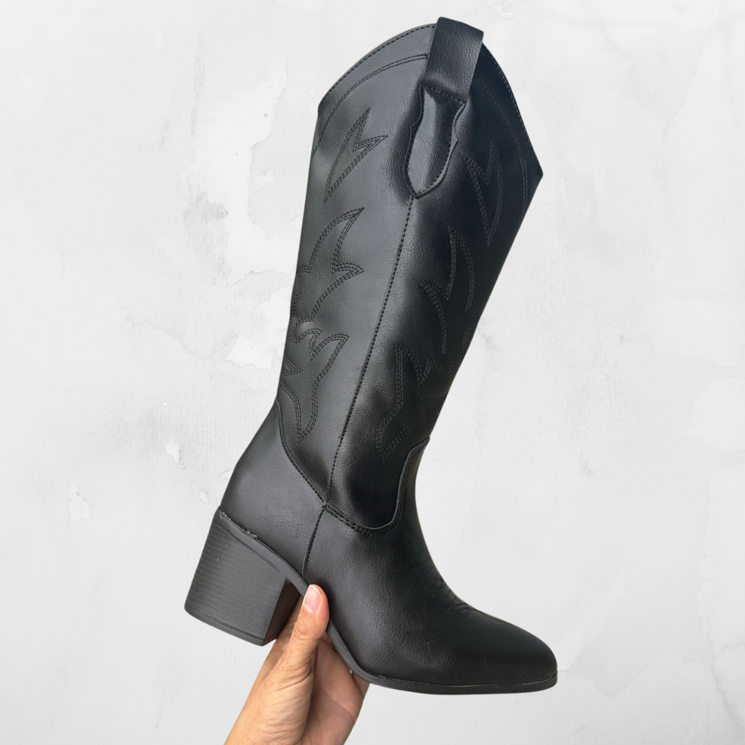 Un clásico atemporal en color negro que aporta elegancia y versatilidad a cualquier look. Las Ride Negra son el equilibrio perfecto entre estilo western y sofisticación moderna. Su diseño estilizado con bordados sutiles y tacón ancho asegura comodidad y presencia en cada paso.